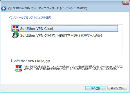 セットアップウィザードが起動します。「インストールするソフトウェアの選択」画面では「SoftEther VPN Client」を選択してください。