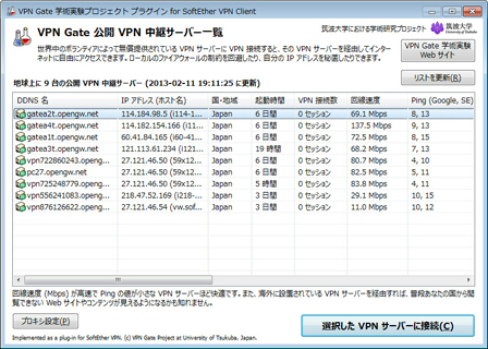 この画面には、現在稼働中の VPN Gate 公開 VPN 中継サーバーの一覧が表示されます。ここで表示されるサーバーの一覧は、トップページ に表示されているサーバーのリストと同一です。これらのサーバーの中から接続したいサーバーを 1 つ選択して「選択した VPN サーバーに接続」ボタンをクリックしてください。